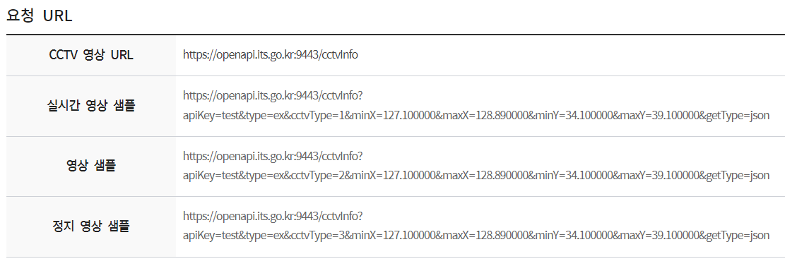 cctv 영상, 실시간 영상, 영상, 정지 영상에 따라 각각 어떤 식으로 주소가 구성되는지를 샘플 url을 통해 보여주고 있다.