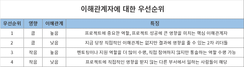 이해관계자를 분석하고, 이해관계자 등록부에 각 이해관계자와 역할에 대해 문서화를 한 후, 이해관계와 영향을 토대로 이해관계자에 대한 우선순위를 부여해야 한다.
