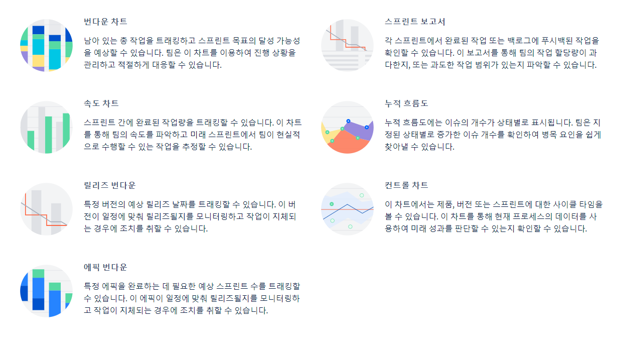 Jira에서는 위 이미지와 같은 여러 종류의 스크럼 보고서 양식들을 제공하고 있다. 대시보드를 통해 해당 스프린트의 남은 기간, 진척상황 등을 보고, 데이터 중심적인 회고를 할 수 있다. 더하여 다음 스프린트에서 개선할 영역들에 대해 더욱 세밀하게 작성할 수 있다.