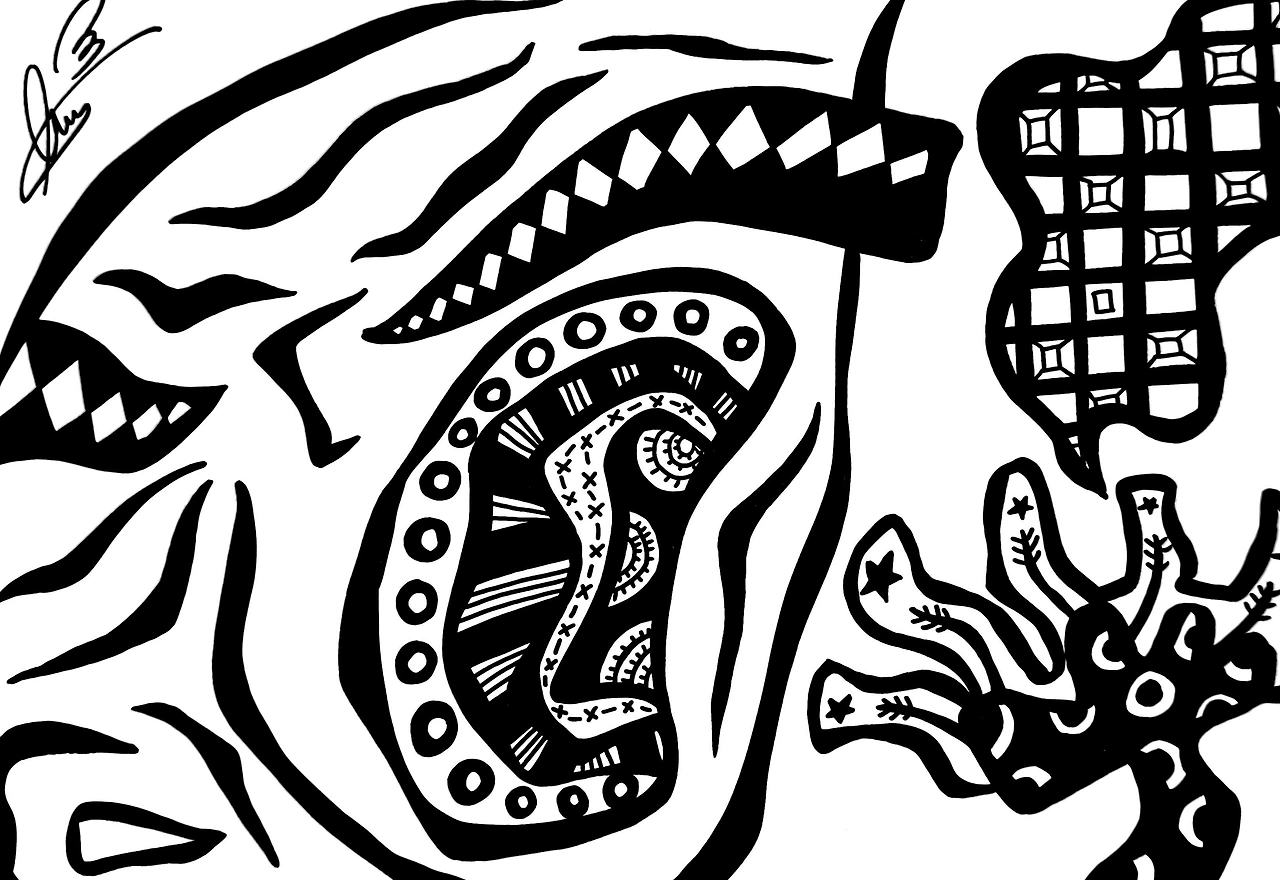 꽃을 쏘아보는 눈빛은 마치 눈알이 꽃을 찌를 듯이 노려봅니다. 이는 더 거세지는 압박과 감시를 의미하지요. 거대한 얼굴은 자신이 더 강압적으로 대해도 된다고 생각하는 듯, 꽃을 삼킬 듯한 위협을 점점 키워갑니다.