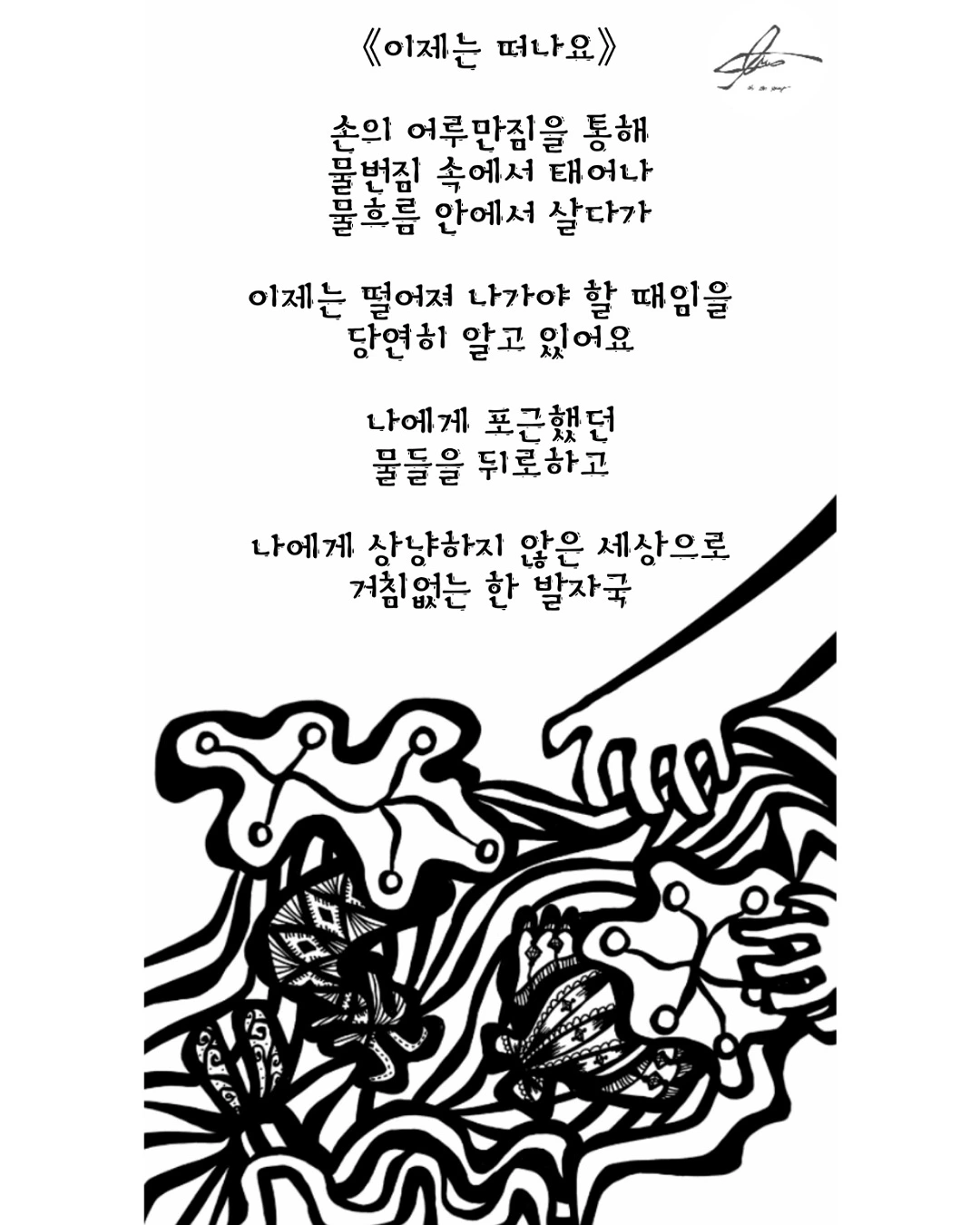 ‘거침없는 한 발자국’이라는 마지막 문장은 앞으로의 방향을 잘 보여줍니다. 화자는 더 이상 물의 흐름에만 머무르는 수동적이고 보호받는 존재가 아닌, 성숙된 자아를 지니고 세상을 향해 첫 발을 내딛습니다. 거침없는 한 발자국은 작지만 단단한 출발이며 그 자체로 성장과 독립을 의미합니다.