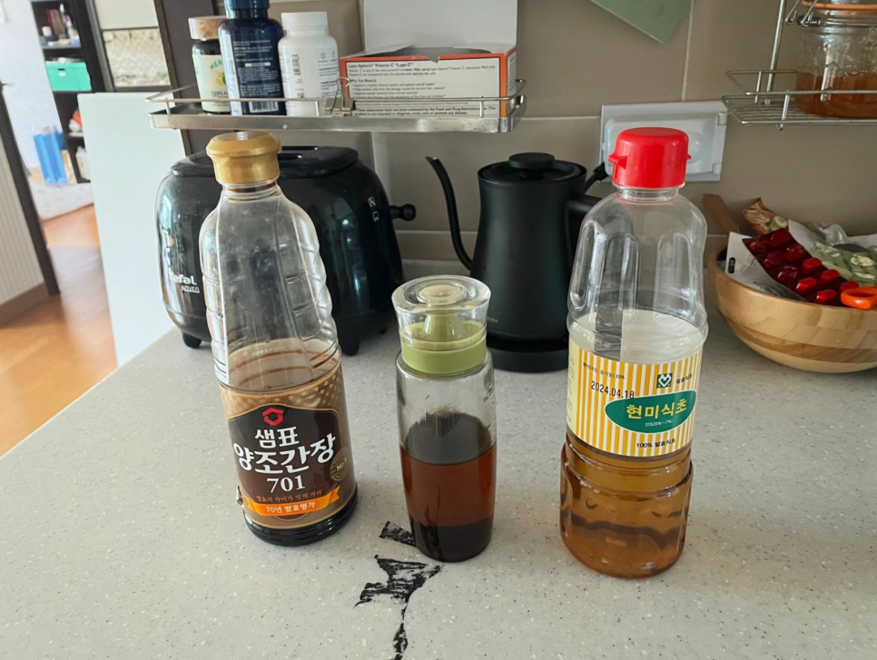A. 냄새 재활 3종 세트. 간장, 참기름, 식초입니다.