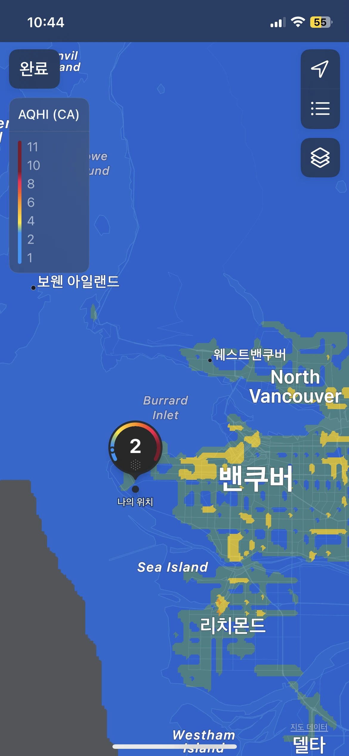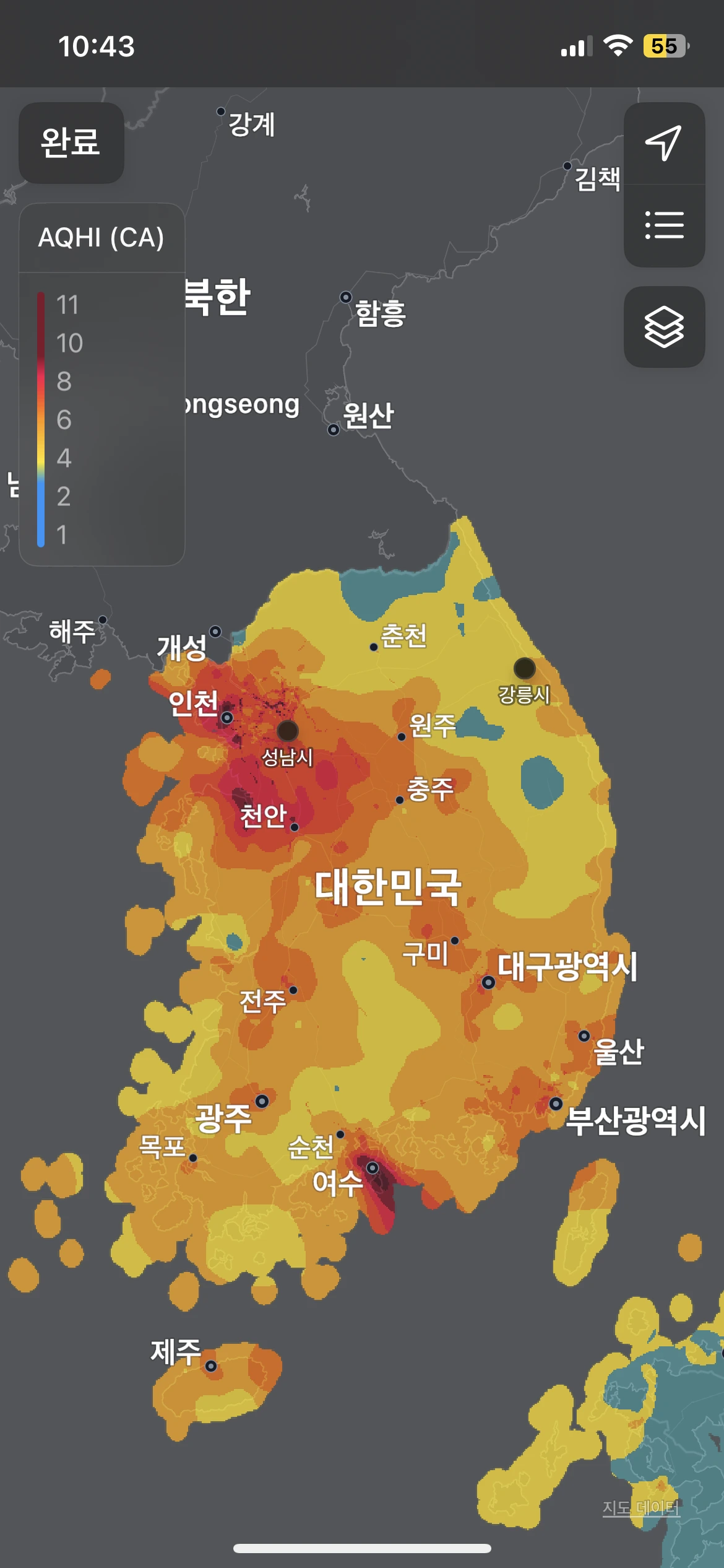 아침에 집밖에 나와 심호흡을 했는데, 와.... 폐 속의 먼지가 씻겨 내려가는 것 같은 상쾌한 기분이란. 아주 시원하고 달콤한 꽃향기 같은 것도 섞여있는 것 같은 느낌이었어요. 미세먼지가 가득한 공기를 그것도 마스크를 쓴 채 마셔야했던 서울과는 너무 다르네요. 공기질을 체크해보니 이렇군요. 잊고있던 파란색 공기는 이런 느낌이었어요.