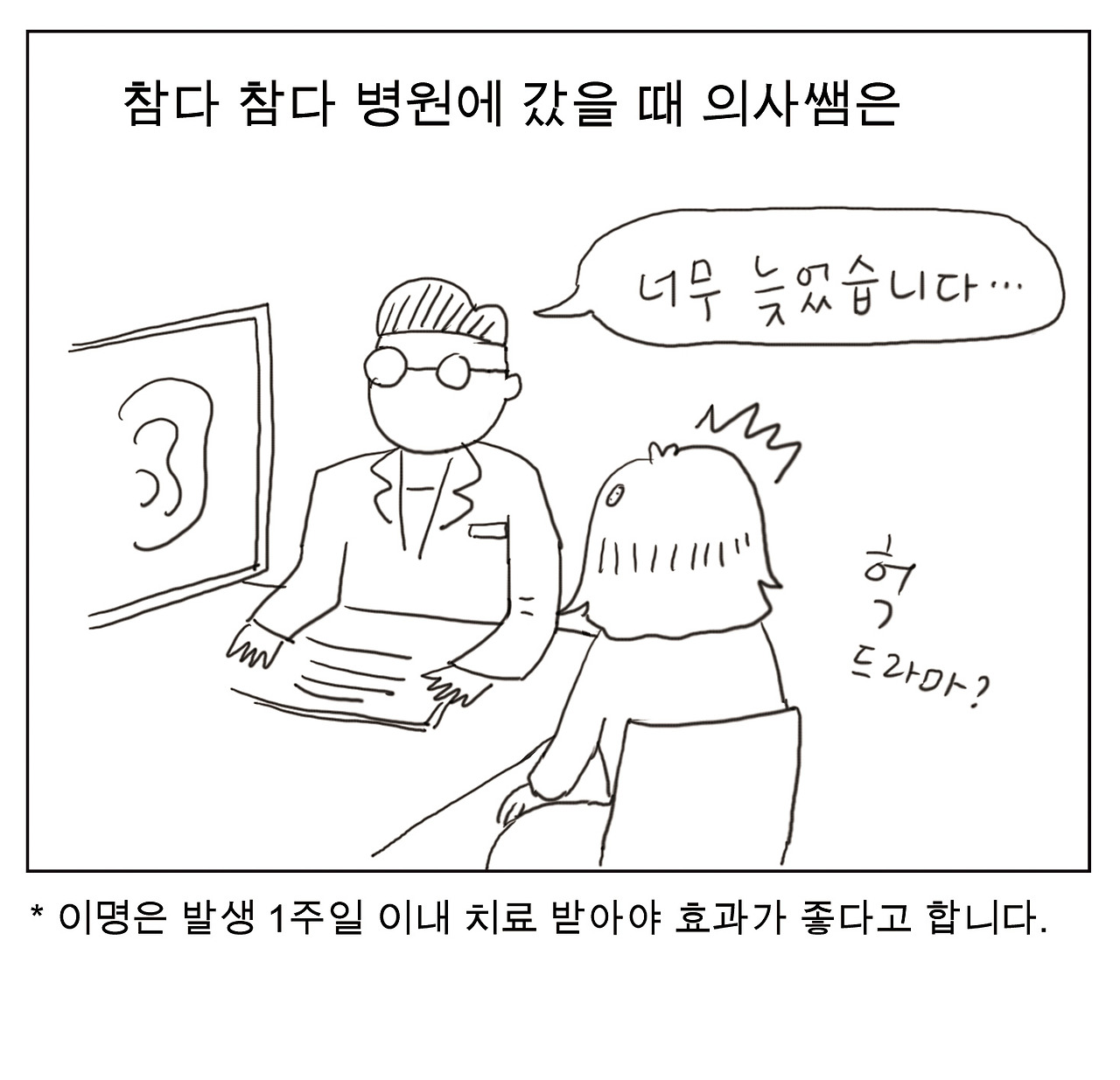 그제서야 부리나케 병원에 찾아갔지만, 드라마에서처럼 왜 이제서야 왔냐고 질타하는 의사쌤… 병원에서 시키는대로 귀에 마취를 하고 스테로이드 고막주사를 기다리던 나는 정말 너무 무서워서, 내 순서가 다가온 순간 도망치듯 병원에서 나오고 말았다.