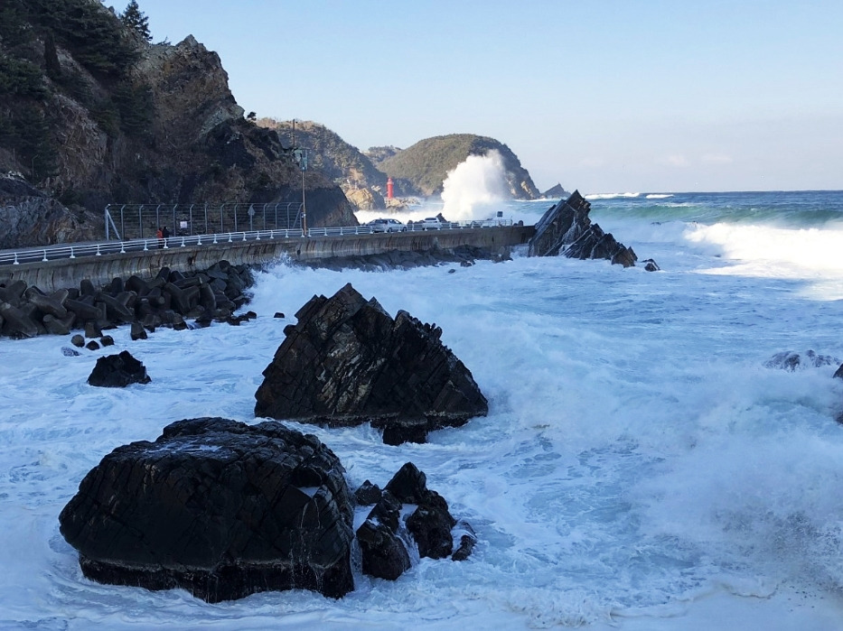 잠시 차를 세워두고 바다 옆을 걸었다. 바람이 무척 센 동해의 파도는 정말 무시무시했다. 한껏 성이 난 파도는 도로 위를 침범해 겉옷과 신발이 젖고 말았다. 차가운 공기 속에 발이 너무 시려웠지만 왜 그 순간이 그토록 재미났었는지. 한겨울에 파도 물벼락 맞고 신이 나 도로 위를 이리저리 뛰어다녔다.