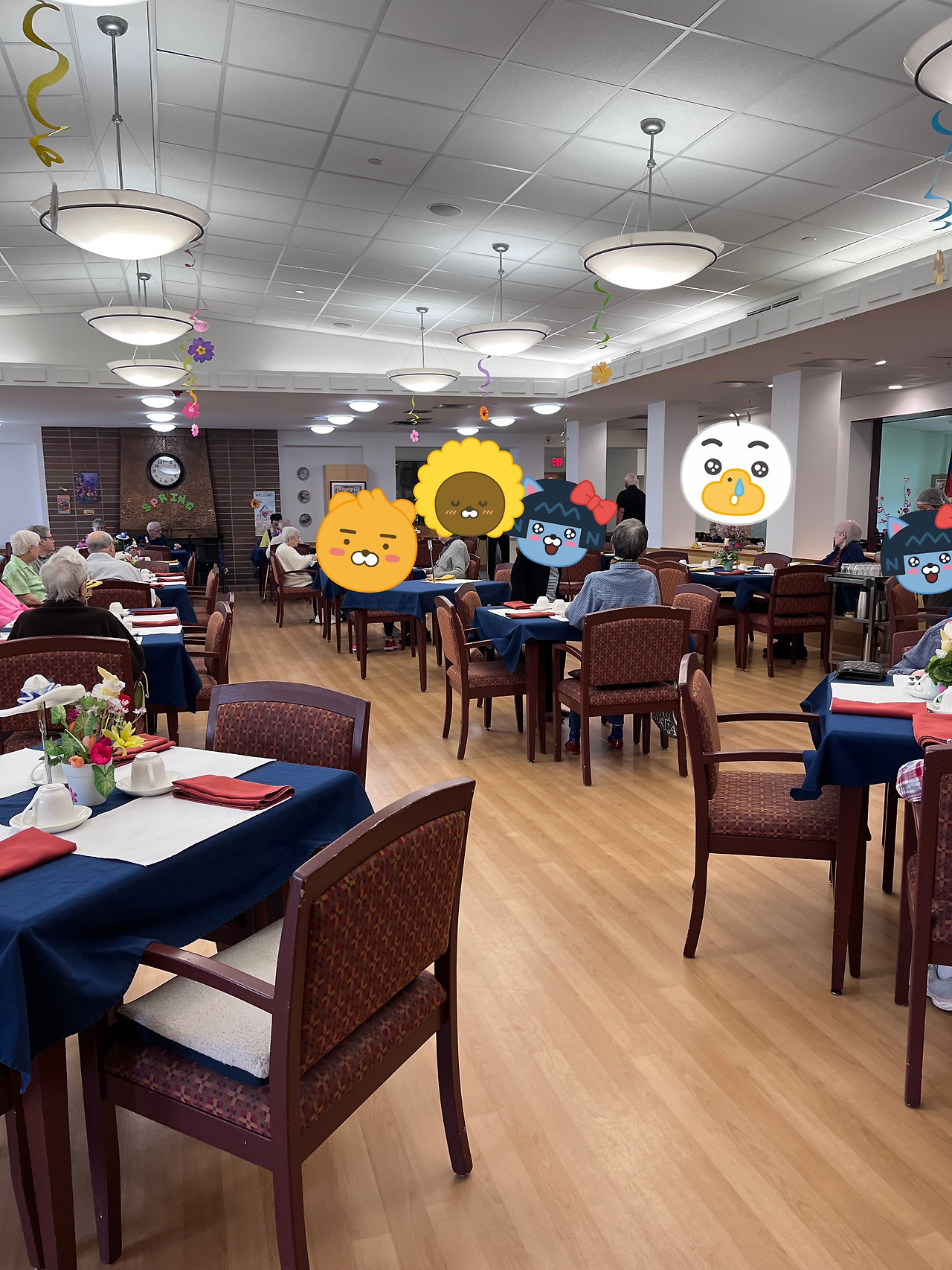 요리가 나오기 전에 식당 직원이 먼저 음료수를 서빙하는데 Erin이 그때 받아 놓았던 주스를 쏟았나 보다. Erin 앞에 앉아 있던 Tom이 나를 불렀다. Erin이 쏟은 주스 때문에 테이블 매트와 냅킨이 다 젖어있었다. 그것들을 깨끗한 것으로 바꿔주었지만 Erin의 빈 컵을 다시 채우지는 않았다. 그때 내가 해야 하는 일은 주민들이 끌고 온 워커를 다이닝룸에서 복도로 옮겨놓는 것이었고 또 어차피 요리가 서빙되기 시작하면 우리 Care Aide들이 음료수를 한번 더 서빙하면서 원하시는 분들의 잔을 채워드리기 때문에 그때 Erin의 컵에 주스를 따라 드릴 생각이었다.