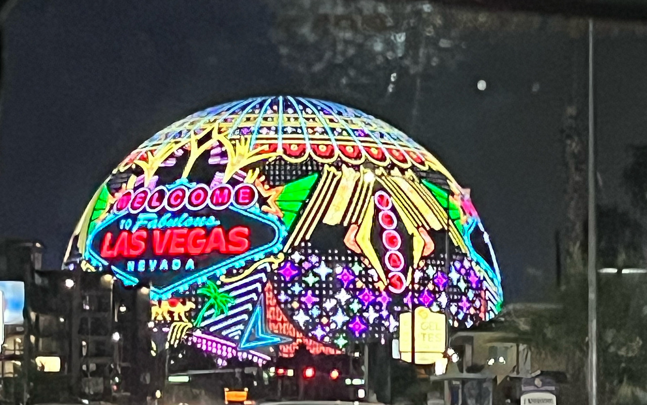 두 달 전에 개장한 돔 모형의 공연장 Sphere. 우리가 여행하는 날에는 F1 라스베가스 그랑프리 경기 때문에 돔이 열지 않아서 가지 못했지만 운 좋게 공항에서 숙소로 가는 중에 이렇게 멋진 사진은 찍었다. 베네시안 호텔의 컨벤션센터가 있는 층에서 Sphere 가 적혀있는 사인을 따라가면 호텔과 이어져 있는 무빙 워크웨이(Moving Walkway)를 지나가게 되고 그 끝에 공연장 입구가 있다.
