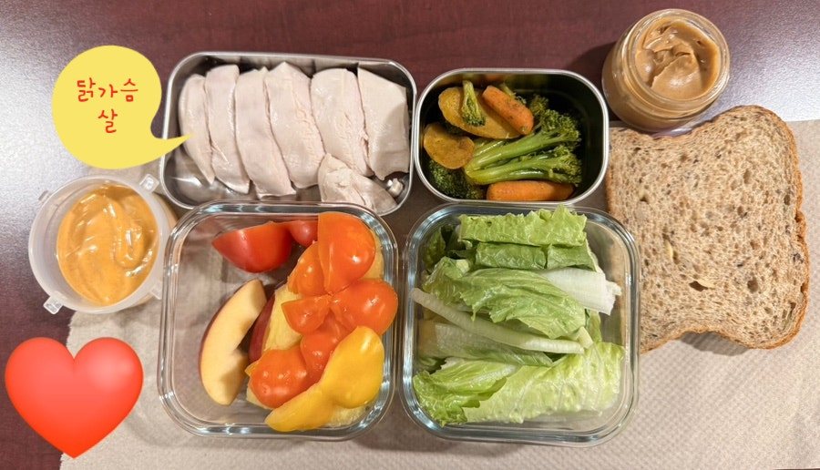 오늘 회사에서 점심을 먹기 직전에 문득 도시락 사진을 찍고 싶었어요. 이제는 익숙해진 <야채 먼저 먹기>와 <운동>으로 지난 2년 동안 11kg을 빼고 유지 중이에요. 내 나이에 이렇게 건강하게 다이어트를 하기가 쉽지 않은데 너무 예쁘게 뺐다는 칭찬을 백만 번 들으면서 인생 후반기를 반짝반짝 빛나게 살고 있답니다.