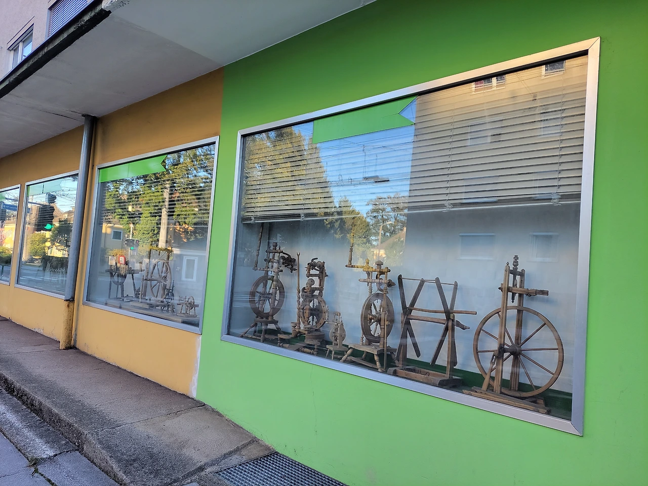 도로의 모퉁이에 자리한 가게의 한쪽 창에는 물레며 다양한 실 잣는 도구가, 다른 창에는 직접 뜬 크로셰 작품이 여러 개 걸려 있었다.