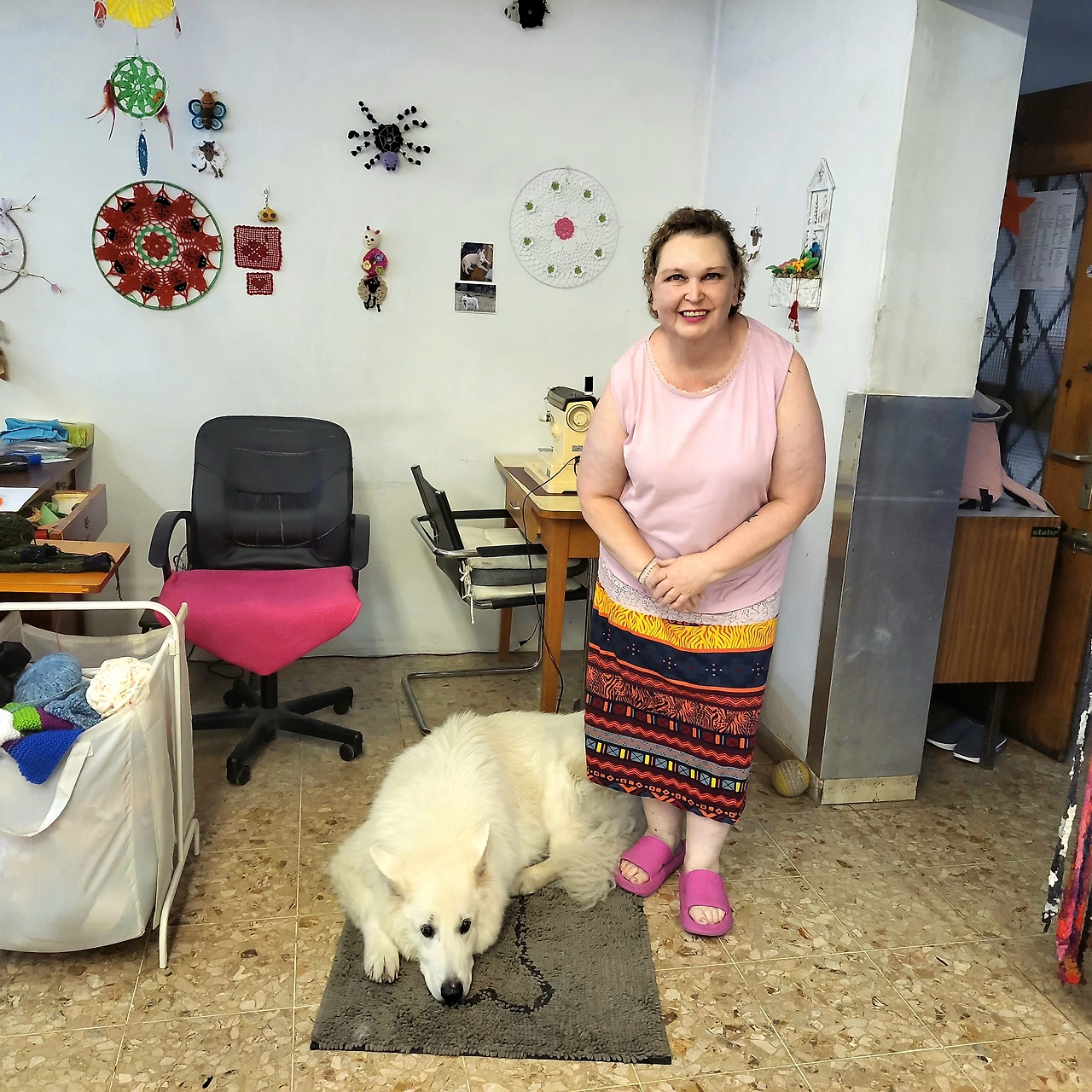 나는 한국에서 온 여행자인데, 여행지마다 실을 하나씩 사고 있어요. 당신 가게와 멋진 개를 기억하고 싶은데 사진 한 장 찍어도 될까요?