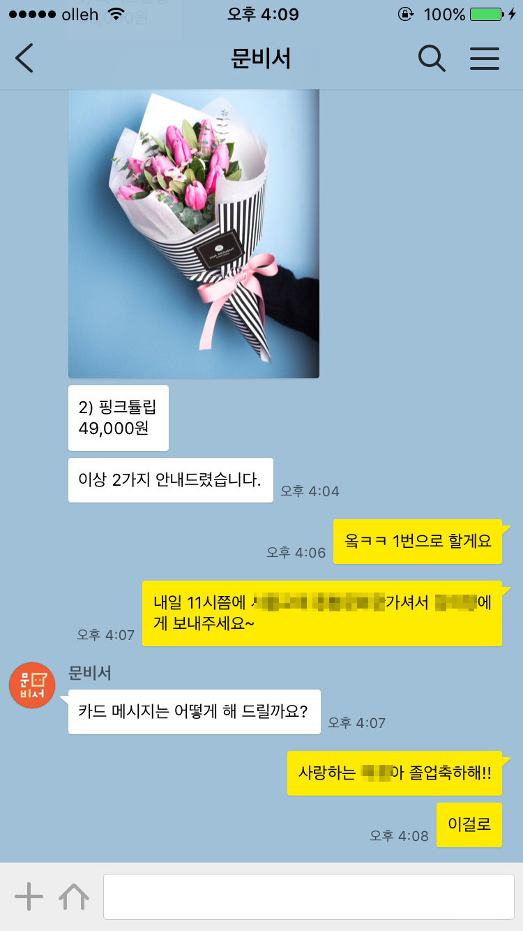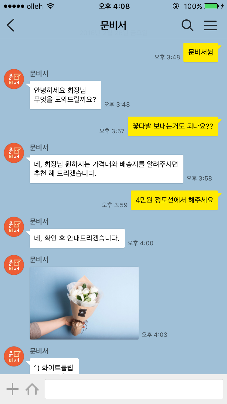 이런 방식으로 채팅을 통해 이런저런 요청을 할 수 있다. 지난번 동아일보 리뷰를 보니 야동을 찾아주는 것과 같은 불법적인 일은 하지 않는 것 같다. 그런데 뭔가 이야기를 해보니 사람과 채팅하는 것 같은 느낌이 들어 물어보니 정말로 사람이 하는 거라고 했다. 실제로 이용해보니 간단한 물건구매 같은 것 말고도 요청할 수 있는 게 많아 보였다. 인공지능이 머신러닝을 하듯이 문비서도 학습을 하나보다. 나중에는 문비서에게 뭘 시킬 수 있는지 공유하는 그룹 같은 게 나오지 않을까?