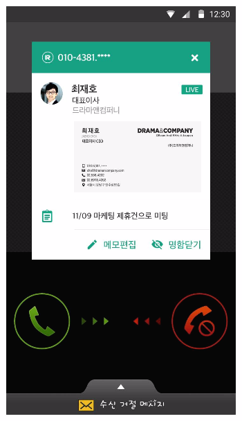 명함이 저장되면 안드로이드에서는 전화가 올 때 명함을 보여준다. (안드로이드가 부러운 유일한 이유다.)