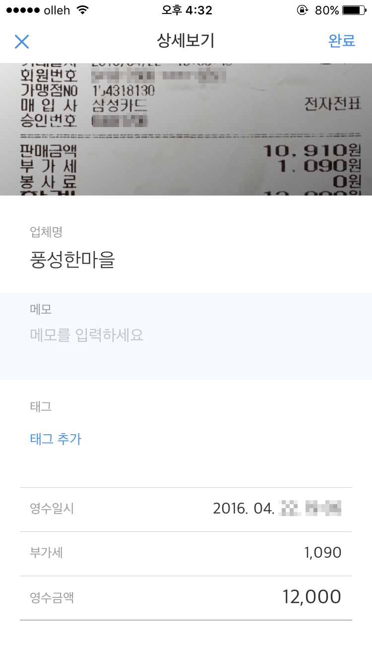 사용 방법은 리멤버와 비슷하다. 앱을 켜고 카메라를 영수증에 가져가면 영수증의 영역이 자동으로 선택된다. 이때 촬영을 하고 업로드를 하면 리스트에 '영수증 입력 대기중' 이라는 문구가 나온다. 이제 여유를 갖고 잠시 기다리면 된다. 잠시 시간이 흐른 후 입력된 내역을 확인할 수 있다. 메모나 태그를 추가할 수 있어 나중에 검색이나 확인을 하기에도 좋다.