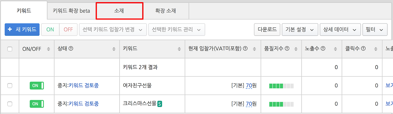 네이버 검색광고는 [캠페인]-[광고그룹]-[키워드]로 이루어져 있다. 광고를 하기 위해선 광고그룹에서 소재를 등록해야 한다.