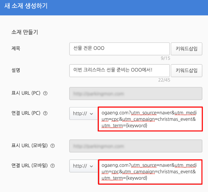 http://ogaeng.com?utm_source=naver&utm_medium=cpc&utm_campaign=christmas_event&utm_term={keyword}