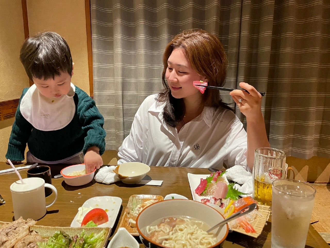 특히 우리는 식당의 경우 미리 찾아둔 곳 중 단 한 군데도 가지 않았는데, 너무나 잘 한 일이었다. 가이드북 추천으로 첫 방문했던 식당의 줄을 보고 '관광객 전용 식당이구나'를 직감한 이후 차를 돌려 동네의 허름한 이자카야를 찾아 들어갔는데, 입장과 동시에 탄성이 나왔다. 아늑한 분위기에 좌식 테이블 네 개가 있고, 그 중 두 자리에 우리 또래의 엄빠와 아들 또래의 아이가 식사를 하고 있는게 아닌가! 마지막 남은 한 자리는, 주저없이 우리가 차지했다.