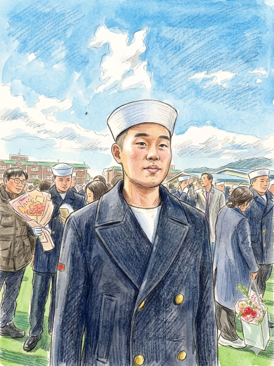 눈물이 쏟아지려는 걸 참고 아들 얼굴을 찬찬히 살폈다. 다행히 고생해서 빠진 얼굴이라기보다 더 건강하고 단단해진 모습이었다. 해군 정복을 입은 모습도 멋졌다. 집에서 보던 앳된 얼굴은 찾아볼 수 없었다. 그런 아들이 낯설면서도 대견해 보였다.