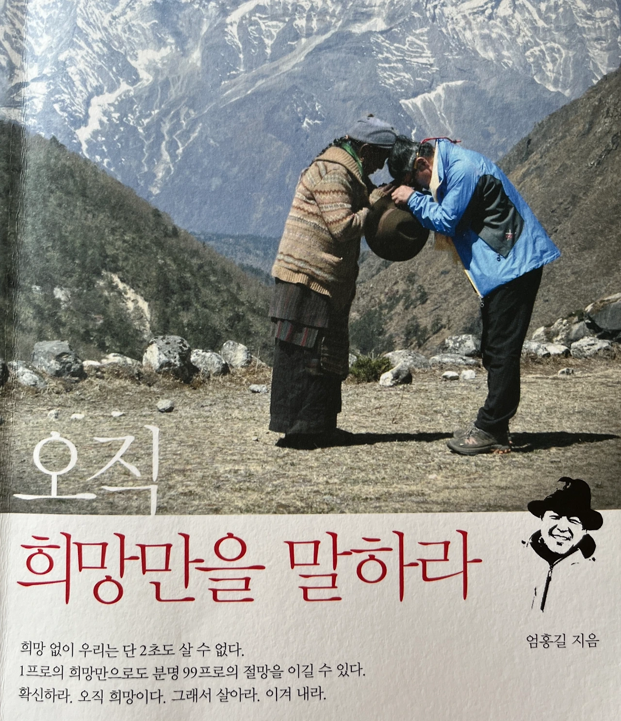 여행 중 호텔 장식장에 놓여있는 책 하나가 눈에 들어왔다. 얼굴은 동상에 걸리기를 반복하여 빨간 건지 거무스름한 건지 분간이 안될 정도로 그을린 얼굴과 미소에 숨은 주름살, 고뇌가 담겨있는 흰 머리카락, 등산 모자를 쓴 그의 얼굴은 네팔에 사는 사람이라 해도 믿을 만큼 현지인스러운 산 사나이 엄홍길 님이다. 엄홍길 대장이라는 호칭이 더 찰떡같은 그의 산문집이자 평생 산만 바라보고 산 그의 일대기 '오직 희망만을 말하라'이다.