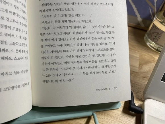 215쪽 : 당신이 속 시원하게 딱 말하지 않고 뜨뜻미지근하니까 그렇죠. 당신 절대로 서린이 이상하게 생각하지 말아요. 당신 혹시 이런 얘기 알아요? 어떤 테레비에서 젊은 여자들 300명을 모아놓고 아주 재미있고 실감 나는 게임을 했어요. '현재 애인은 가난한데 10억 가진 남자가 나타나 프러포즈를 했다. 어떻게 할 것인가. 애인을 바꿀 것인가, 말 것인가?' 조용한 가운데 여자들은 비밀 전자투표기의 버튼을 눌렀어요. 그리고 곧 커다란 스크린에 그 결과가 나타났어요. 표시된 숫자는 210.