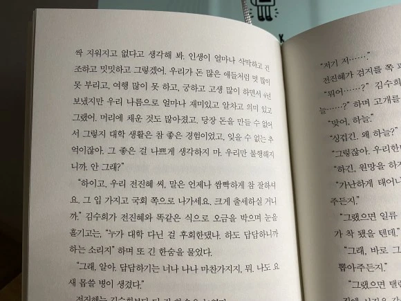 299쪽 : 상황이 아무리 답답하고 따분해도 대학 세월을 후회할 건 없어. 결코 헛세월 보낸 게 아니니까. 그 4년 동안의 온갖 경험들이 우리 인생에서 싹 지워지고 없다고 ㅅ애각해 봐. 인생이 얼마나 삭막하고 건조하고 밋밋하고 그렇겠어. 우리가 돈 많은 애들처럼 멋 많이 못 부리고, 여행 많이 못 하고, 궁하고 고생 많이 하면서 4년 보냈지만 우리 나름으로 얼마나 재미있고 알차고 의미 있고 그랬어. 머리에 채운 것도 많아졌고. 당장 돈을 만들 수 없어서 그렇지 대학 생활은 참 좋은 경험이었고, 잊을 수 없는 추억이잖아. 그 좋은 걸 나쁘게 생각하지 마. 우리만 불행해지니까. 안 그래?