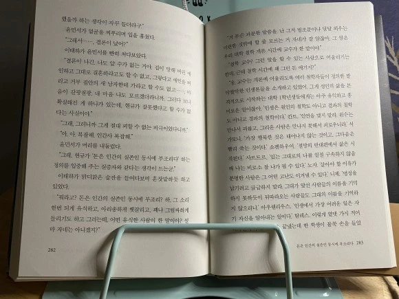 284쪽 : 인생에 있어서 돈이란 무엇입니까? 이 질문은 아무 돌발적이고, 신선했어. -중략- 교단 끝에서 휙 돌아선 교수가 칠판 빈 데다 쓰기 시작했어. '돈은 인간에게 실존인 동시에 부조리다.' 이렇게 쓴 교수가 돌아서더니 '오늘 강의는 끝!'하고 강의실을 나갔어.