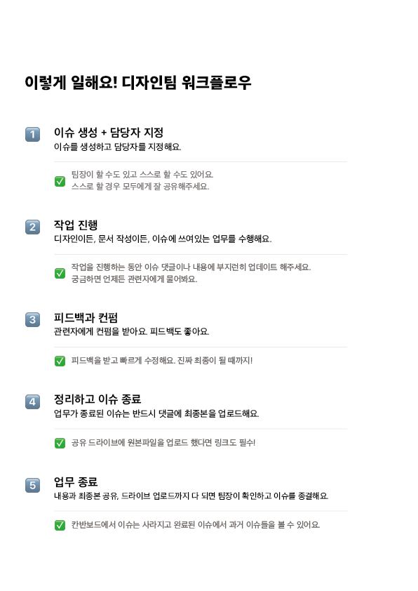 그래서 선택한 것은 '적극적인 지라 이슈의 사용'이었다. 내가 담당자로 배정하는 일이든, 외부에서 직접적으로 받은 일이든 실제 업무 담당자는 이슈를 반드시 만들어서 진행 중 보드로 옮겨 일을 진행하기로 했다. 구체적인 워크플로우 내용을 내가 만들고 문장으로 써서, 아예 디자인팀 워크플로우로 인쇄해서 붙여주세요! 를 업무로 요청했다. 워크플로우 안내지를 인쇄해서 잘 보이는 곳에 붙여두고 두 분은 해당 내용에 따라 이슈를 열심히 사용해주셨다. 나 역시 마찬가지로 내가 하는 일들을 이슈에 작성해 보드에 올려두었다.