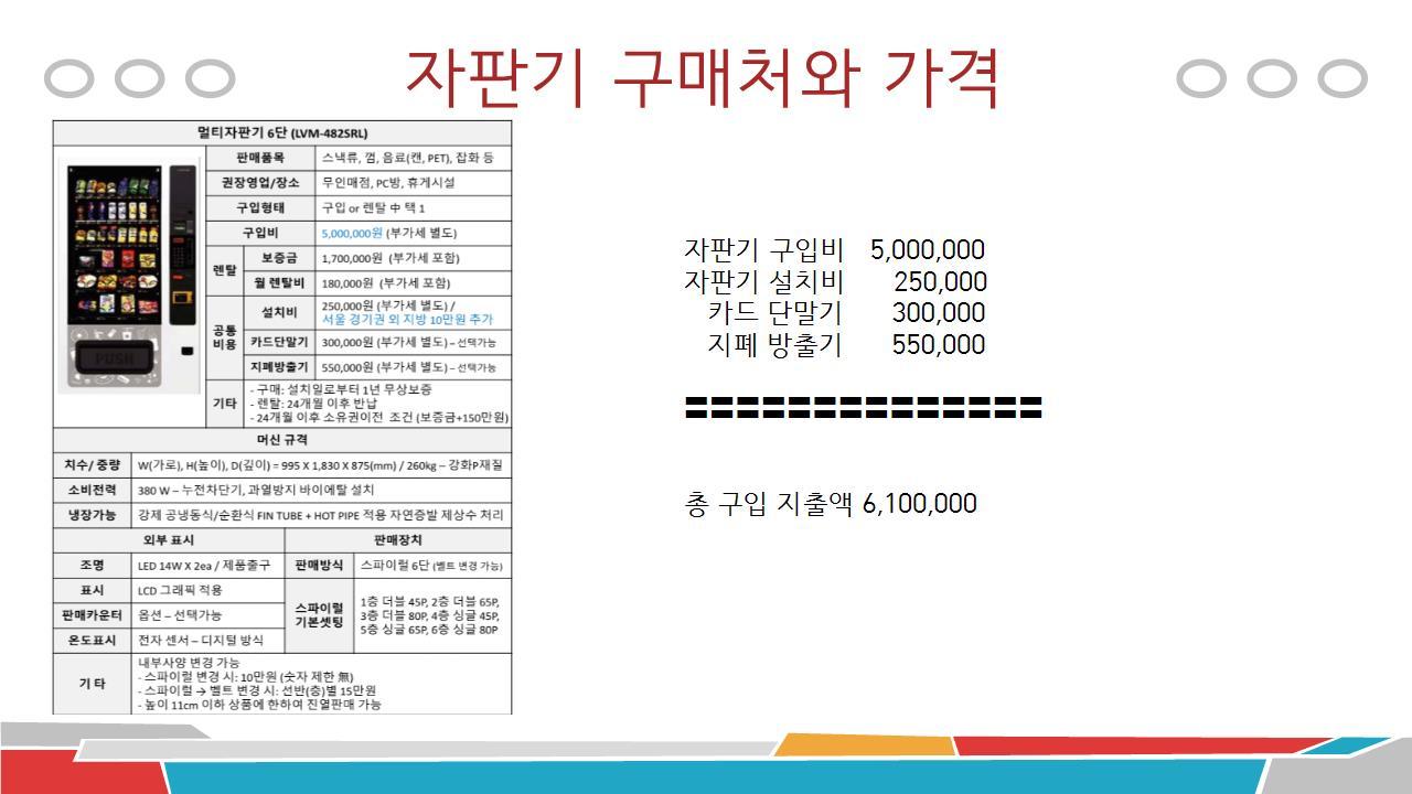 자판기를 구입하고 설치하고, 그 안에 카드 단말기와 지폐 방출기를 다 설치하는데 6백만원 정도의 돈이 들었다. 물론, 이건는 매매 가격이다. 자판기를 대여하는 경우도 있어서 대여 가격도 물어는 봤었다. 아무래도 대여는 달달이 돈을 내게 된다.