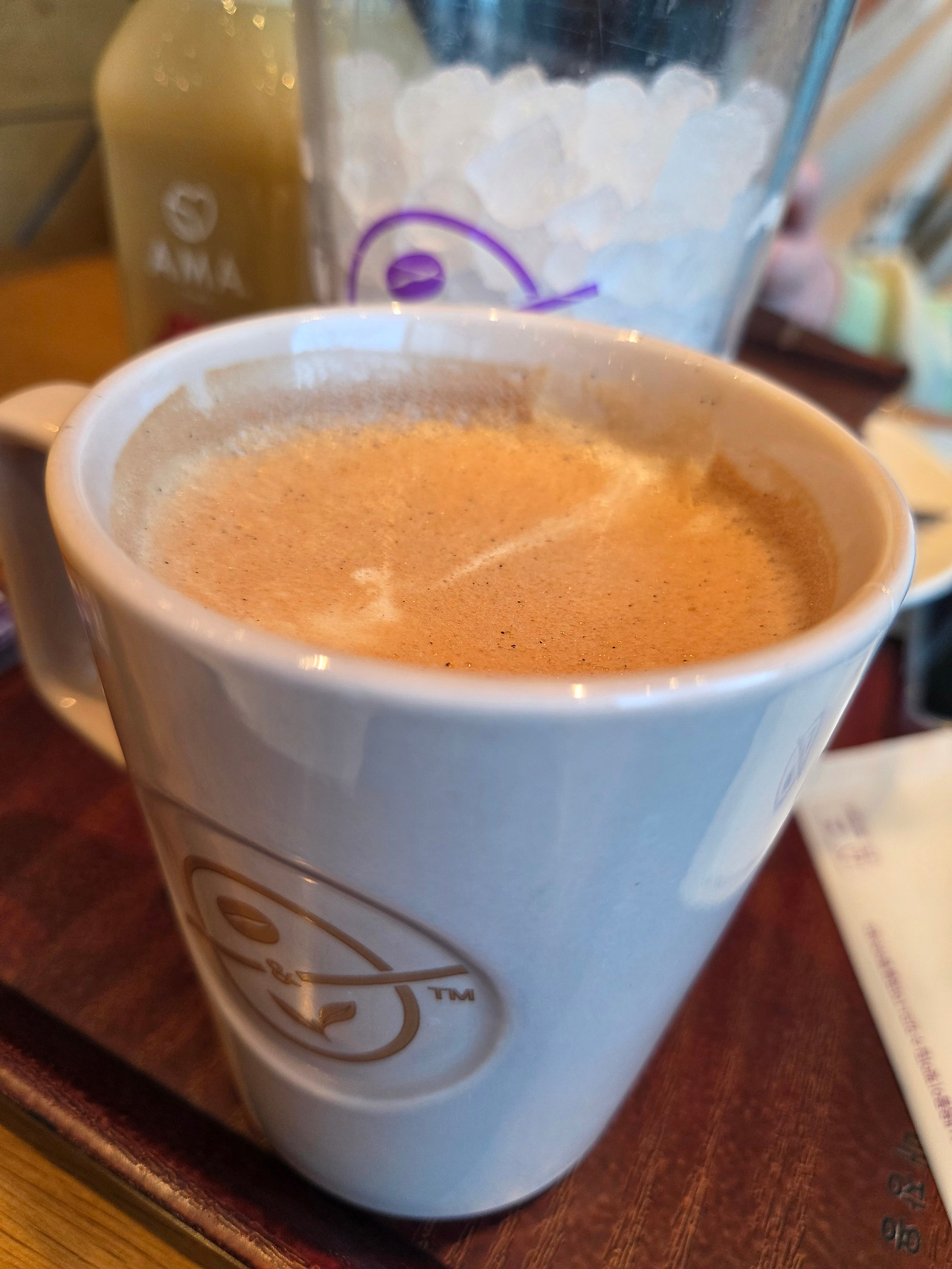 진한 에스프레소 투 샷에 풍성하고 부드러운 우유 거품이 기존의 라떼 보다 적게, 살짝 들어간 플랫 화이트에 바닐라 시럽 펌핑이 들어간 음료다. 많이 달지는 않다. 바닐라 시럽 펌핑도 반으로 줄여 달랬기 때문에, 플랫 화이트 커피 맛에 살짝 감도는 단맛 정도다.