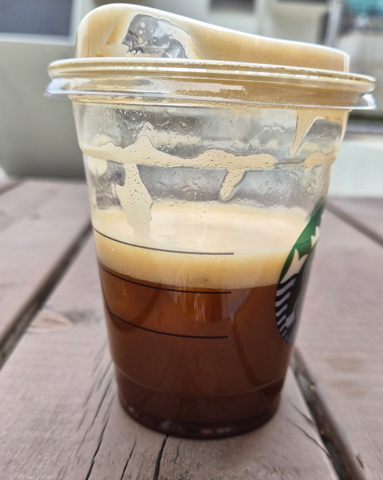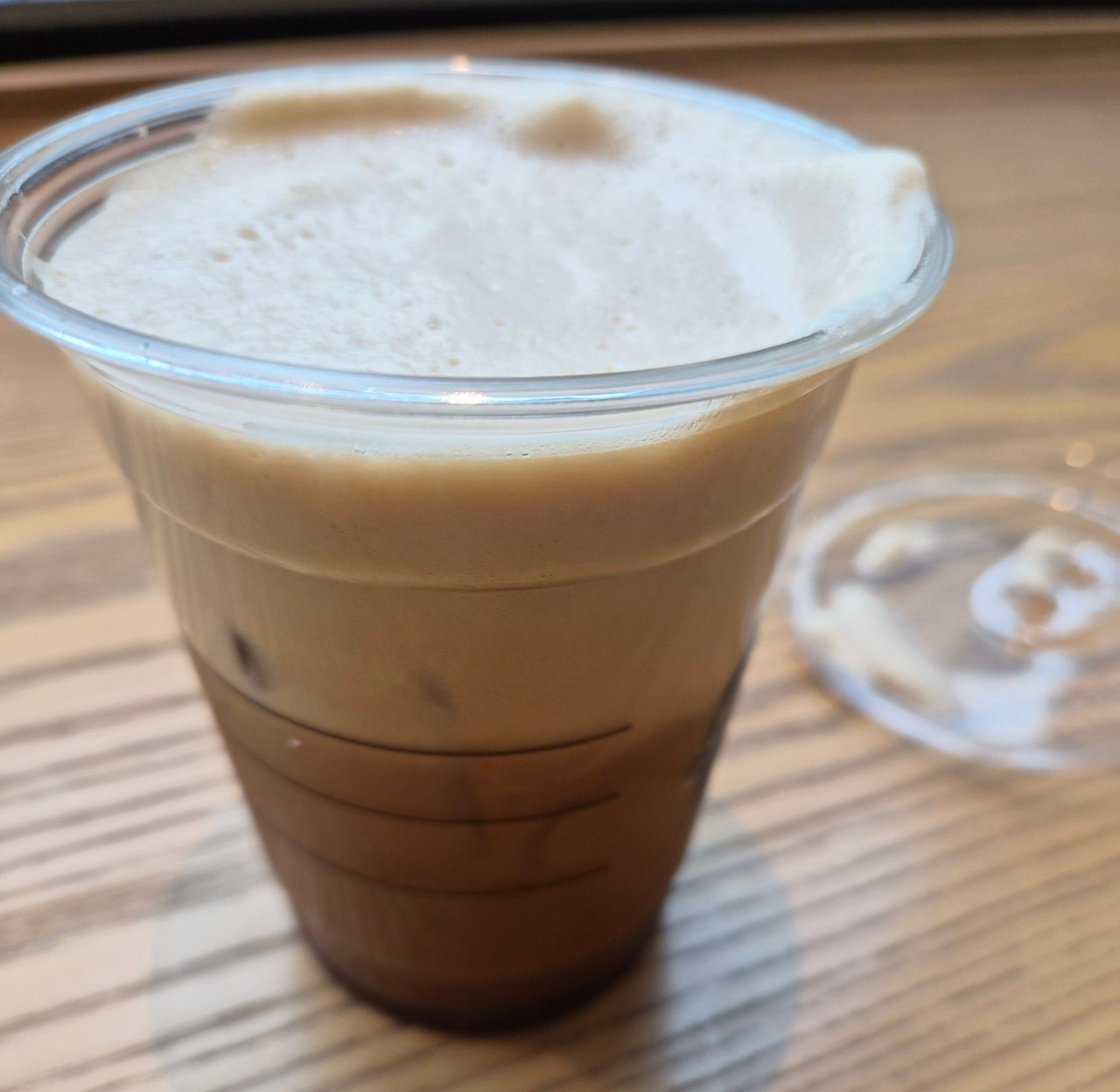 부드러운 거품의 층이 두껍게 얹어져 있다. 부드러운 거품이 뒤덮어 버린 바로 아래 층에는 아메리카노 원액이 보인다.