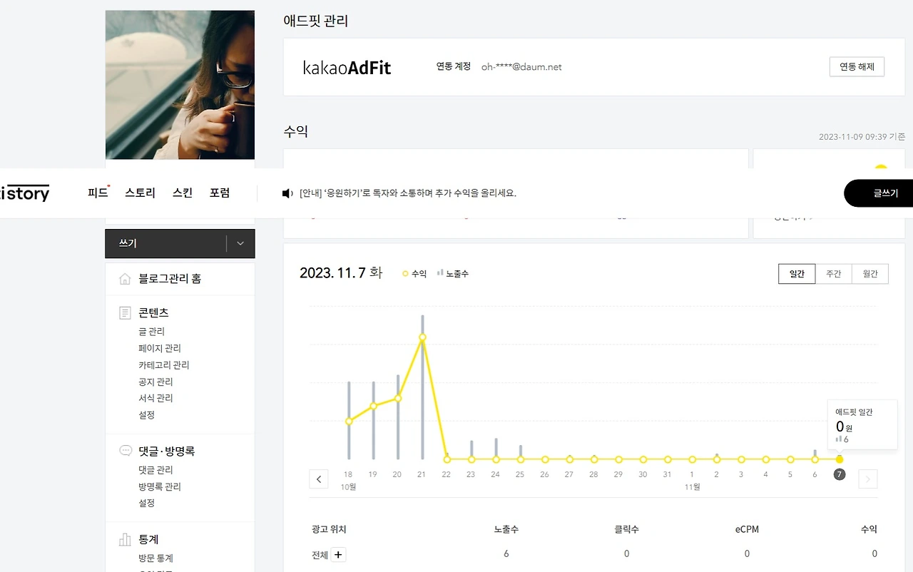그런데 유투브에서 부풀려 홍보하는 것처럼 수입이 그리 쉽게 발생하지는 않는다. 나는 처음에 다른 사람의 T-story 블로그도 광고를 눌러 줘야 내 T-story 블로그의 광고도 클릭이 되겠지 싶어서 다른 T-story 블로그도 열심히 방문해 광고를 클릭해 줬다.