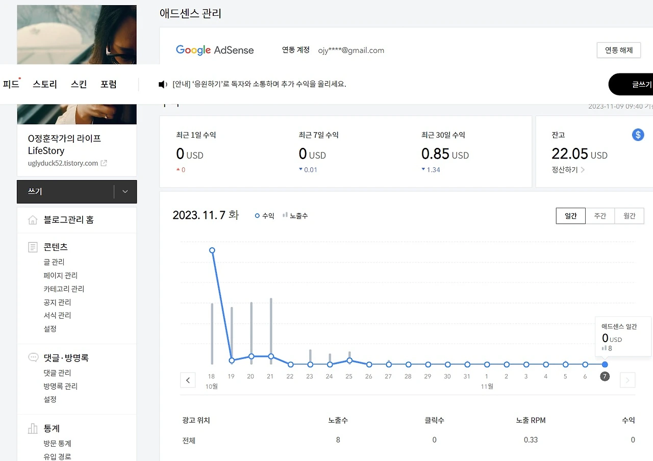 광고 하나를 그렇게 누가 제대로 클릭을 해 주면 애드센트 수입은 한 번에 0.2나 0.3 정도가 내 수입으로 발생 된다고도 들은 거 같다. 내 애드센스 통계에 수입이 22.05USD 정도면 몇 달 만에 28,909.76원의 수입이 발생한 것이다.