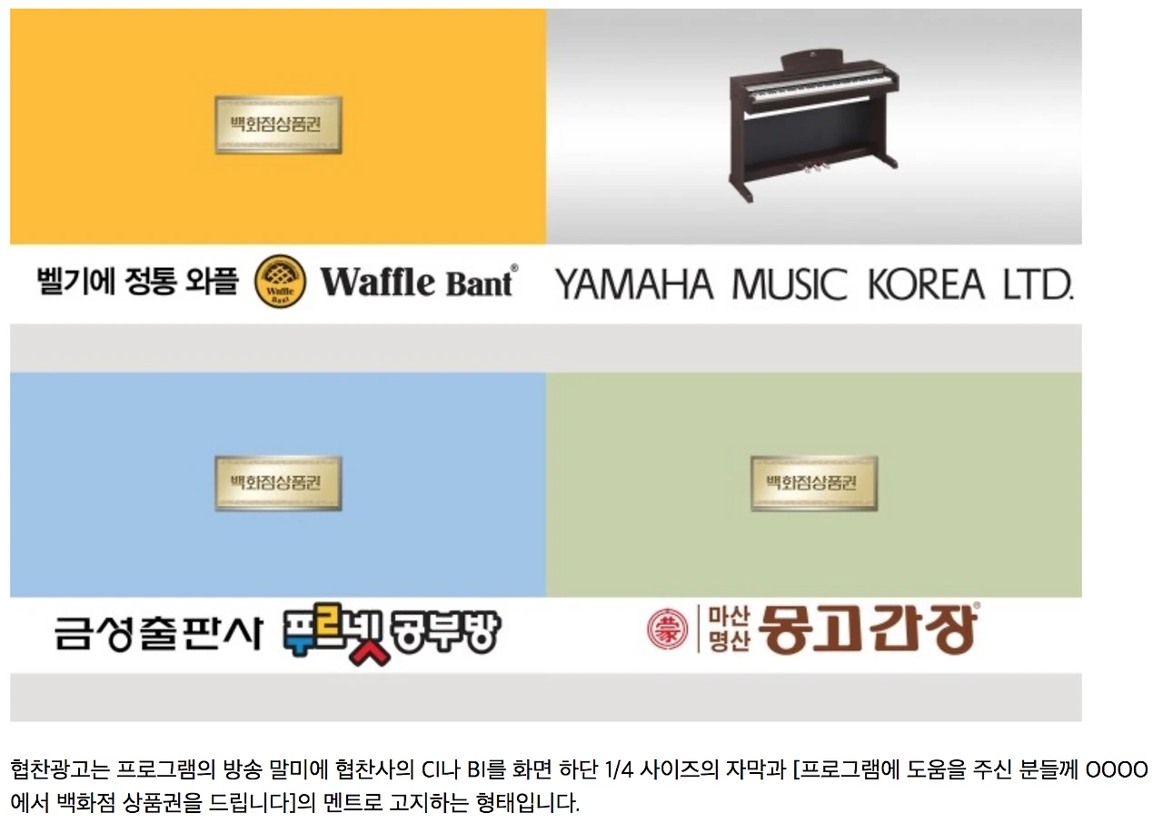 이러한 협찬품은 말했다시피 대부분 백화점 상품권이다. TV 예능프로그램을 볼 때 마다 끝날 때쯤 흔히 들을 수 있는 “프로그램에 도움을 주신 분께는 XXXX에서 백화점상품권을 드립니다”는 코멘트에 상품권 사진과 함께 등장하는 그 상품권이다.