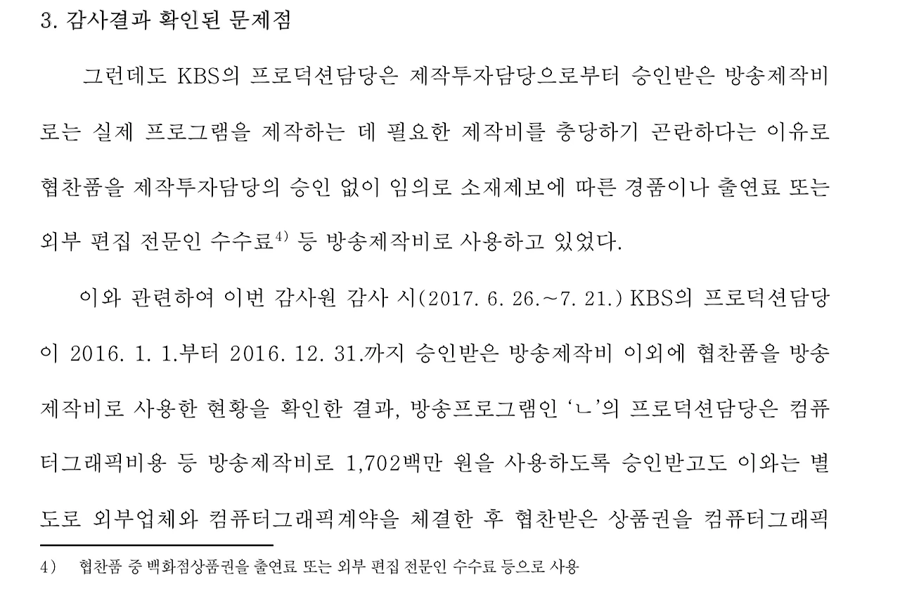 감사원은 2016년 한 해 동안 방송된 KBS 프로그램 107개를 조사했는데, 모두 88억원 상당의 협찬품을 승인받은 제작비와는 별도로 사용했다고 한다. 그 중에는 제작비가 2억원으로 책정된 프로그램이 협찬품으로 무려 10억원을 사용한 경우도 있었고, 제작비 9300만원짜리 프로그램이 협찬품으로 1억4000만원을 사용한 경우도 있었다. 제작비 2억8000만원 프로그램이 협찬품으로 4억2000만원을, 제작비 15억 짜리 프로그램은 협찬품도 12억원 넘게 사용한 경우도 있었다.
