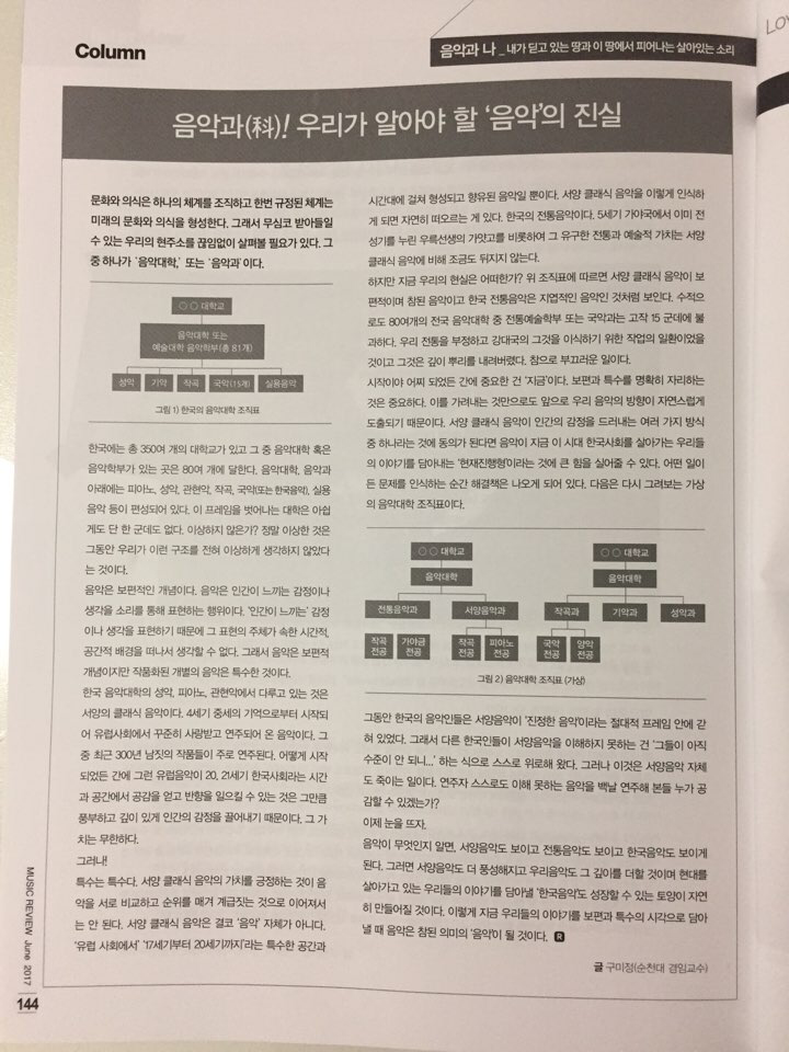 문화와 의식은 하나의 체계를 조직하고 한번 규정된 체계는 미래의 문화와 의식을 형성한다. 그래서 무심코 받아들일 수 있는 우리의 현주소를 끊임없이 살펴볼 필요가 있다. 그 중 하나가 ‘음악대학,’ 또는 ‘음악과’이다.