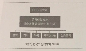 한국에는 총 350여 개의 대학교가 있고 그 중 음악대학 혹은 음악학부가 있는 곳은 80여 개에 달한다. 음악대학, 음악과 아래에는 피아노, 성악, 관현악, 작곡, 국악 (또는 한국음악), 실용음악 등이 편성되어 있다. 이 프레임을 벗어나는 대학은 아쉽게도 단 한 군데도 없다. 이상하지 않은가? 정말 이상한 것은 그동안 우리가 이런 구조를 전혀 이상하게 생각하지 않았다는 것이다.
