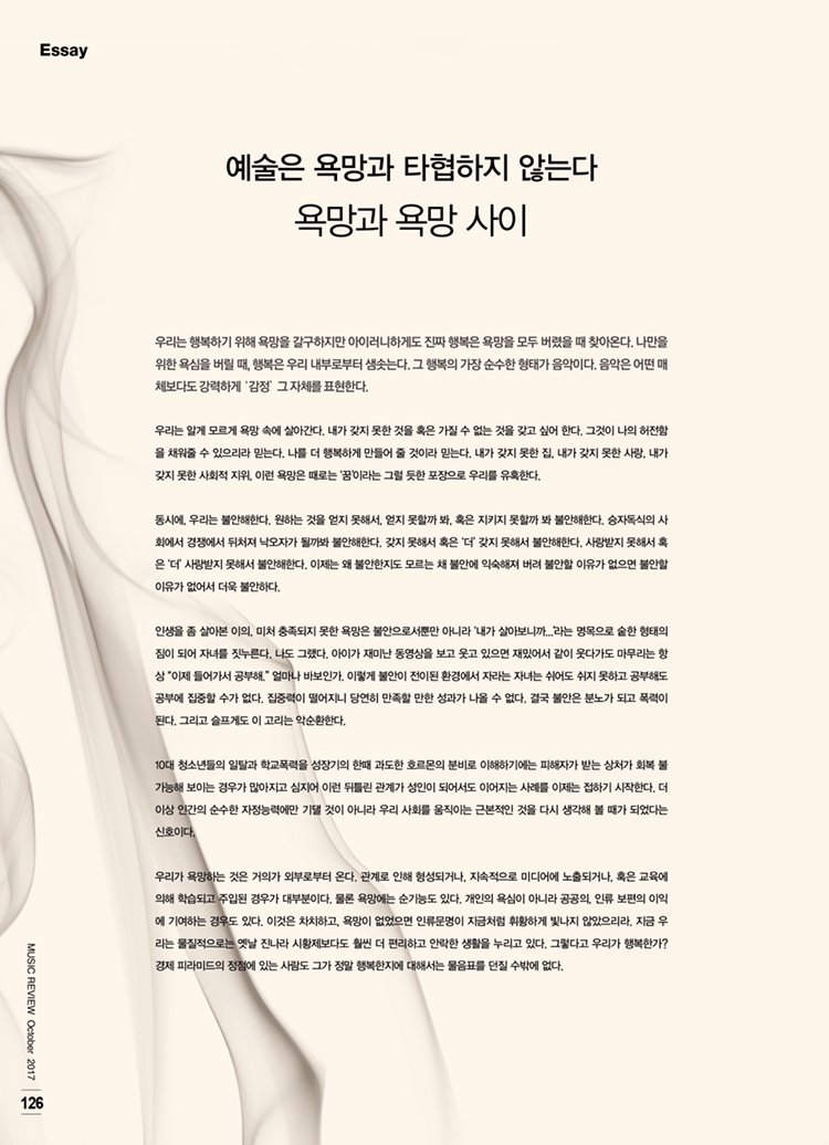 그래서일까, 예술은 욕망에 타협하지 않으면서도 끈질기게 살아남는다. 아니, 욕망에 타협하지 않기 때문에 살아남는지도 모른다. 예술은 인간을 인간 본연의 모습으로 돌아가게 한다. 현대 사회에서 욕망과 욕망 사이를 채워주고 욕망의 불을 식혀 모두가 공생할 수 있게 해 주는 것은 예술, 오직 예술이다.