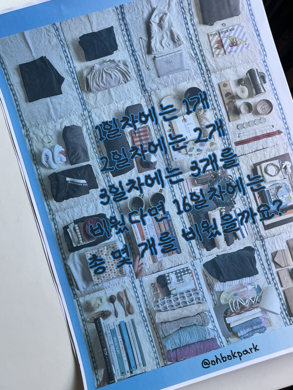 첫날 아침, 한 번도 입지 않는 레깅스를 손에 들었다. 예쁜 천을 책상에 깔고 사진을 찍었다. 두 번째 날 아침, 기장이 조금 짧아서 손이 잘 안 가는 요가바지 하나와 이미 같은 색이 있는 가디건 하나를 가지런히 갰다. 역시 천 위에 두고 사진을 찍었다. 셋째 날 아침, 하트 모양에 반해 샀지만 길이감이 안 어울려서 내내 서랍에 있던 목걸이와 역시 영 안 어울리는 모자, 오래된 여행 파우치를 천 위에 올려두고 사진을 찍었다. 그렇게 4,5,6... 10일 차.