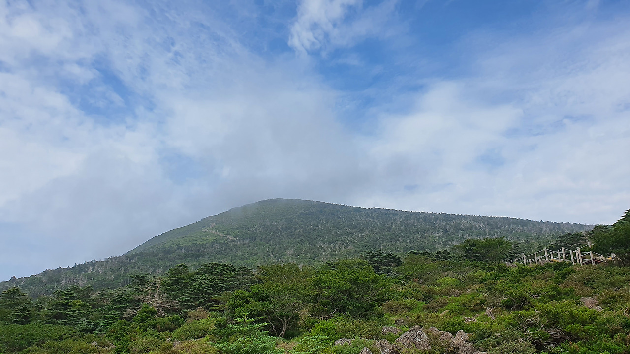 어젠 사실 반가운 분들과 늦게까지 담소를 나눴습니다. 손님 한 분이 오늘 육지로 돌아가셔서 사장님과 저 모두 아쉬운 마음에 밤의 끝자락을 붙잡고 채 놓지 못합니다. 새벽 4시 출발하기로 했지만 집에 들어오니 2시입니다. 피곤한 몸을 이끌고 따라가려니 오늘도 쉽지만은 않습니다. 하지만 더 여유롭게 보고자 구석구석 등반길을 관찰합니다. 오랜 장마 뒤의 등반이라 그런지 사람들이 한동안 오가지 않은 흔적이 눈에 띕니다. 쓰레기가 없고 발자국이 많지 않습니다. 가다 보니 사슴인지 노루인지 사람을 보고 놀라지도 않고 천연덕스럽게 제 옆으로 자기 갈길 지나갑니다.