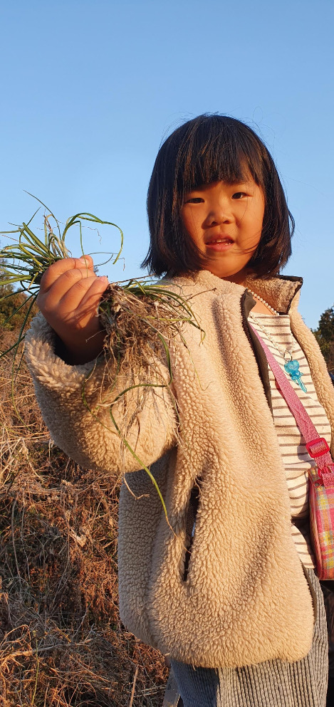 수확을 마치고 집에 돌아가려는데 다시 문자가 온다. '도로 입구 달래 밭으로!' 차를 돌린다. 도로 입구에서 달래를 보긴 했는데 어떻게 해야 하는지 몰라서 그냥 지나쳤던 터라 문자를 받고는 신이 났다. 집사님과 권사님께서 친절하게 달래 캐는 법을 알려주신다. 순식간에 오늘 저녁 찬거리가 생겼다. 달래무침은 정말 좋아하는 메뉴다. 아이들도 달래를 처음 보는지 신기한 듯 열심히 캔다. 달래는 하나하나 캐기가 쉽지는 않았다. 정성 들여 캐야 한다. 그저 지천에 널린 식재료들을 쉽게 구할 수 있음에 감사할 따름이다. 길가에 쑥과 갓도 넘쳐난다. 잘 몰라서 못 먹을 뿐이다. 이처럼 재료가 너무 많다 보니 조금씩 내려놓는 법을 배우게 된다. 욕심내서 가져와도 보관을 잘 못해서 버리게 되면 너무나 아깝기 때문에 욕심내기보다는 우리가 필요한 만큼만 수확한다. 이스라엘 민족들이 광야를 헤매던 시절 하나님께서는 '일용할 양식'을 주셨다고 했다. 우리도 욕심 없이 '일용할 양식'만 수확하는 법을 배워간다.