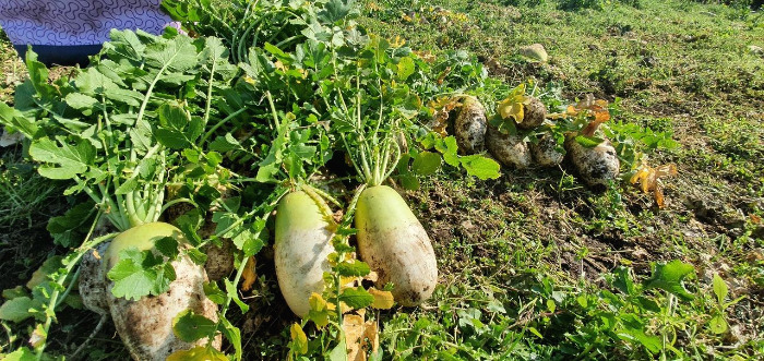 * 올레 위에 올려둔 무청. 하지만 무청은 바람이 잘 나는 그늘진 곳에 말려야 했다. 첫 수확의 기쁨도 잠시 무청 말리기를 실패하여 아쉬웠지만 덕분에 3월 본격 겨울무 수확 때 엄청난 양의 무청을 잘 말려서 1년 치 식재료를 확보한다.