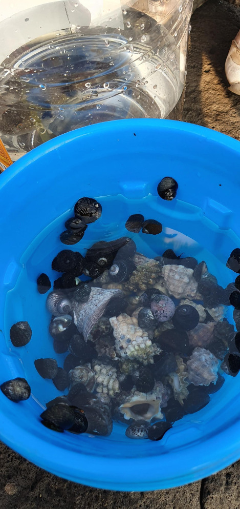 보말과 매옹이. 간조일 때 더 큰 보말을 줍기 쉽다. 눈에 보이는 대로 다 주워와도 다음날 가보면 또 잔뜩 있다. 아빠가 바위를 들면 가족들이 얼른 줍기를 반복한다.
