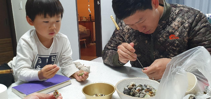 어느 바다에서든지 쉽게 구할 수 있는 보말은 너무 맛있는 재료다. 얼려놓고 오래 먹을 수도 있다. 조리하는 과정이 지난하지만 견딜 만큼 맛있다. 보말 빼는 작업 중인 아빠.