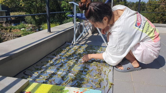 며느리에게도 안 가르쳐준다는 나만의 고사리밭을 찾아냈다. 거의 매일같이 그곳으로 출근했다. 고사리를 따고 간식을 먹고 쓰레기를 줍고 집에 와서 고사리를 씻고 삶은 후 말리는 일상이 반복됐다. 단조로울 것 같은 그 일상에서 농부의 삶을 엿보았다. 땀 흘리며 허리 굽혀 수고한 만큼 소출이 생겼으며, 집에 와서 씻고 삶는 과정은 한껏 기대감을 높였다. 무엇보다 백미는 바로 햇살 좋은 날 고사리를 말리는 작업이다. 2층 베란다에 넓게 돗자리를 펴두고 바람에 날리지 않도록 돌로 괴어놓는다. 삶은 고사리를 널찍하게 펴서 말리고 하루쯤 지나면 엄청나게 컸던 제주 고사리가 온데간데없고 말라비틀어지고 쪼그라진 볼품없이 타다 남은 성냥개비처럼 생긴 것들이 널브러져 있다. 하지만 이게 진짜다. 행여나 부서질까 조심스럽게 집어 봉투에 담아둔다. 서늘한 곳에 보관하면 1년 내내 먹을 수 있다고 한다. 농협 하나로마트 가격 기준으로 하루에 우리가 수확한 양 정도면 5만 원 돈 한다. 엄청난 양이다. 그러니 한 달 동안 고사리만 따서 팔고 숙박비를 벌어간다는 얘기가 거짓이 아닌 거다.