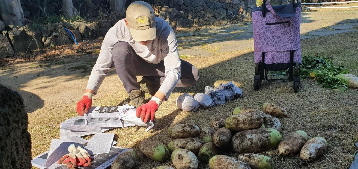 육지로 선물로 보내기 위해 흙을 털지 않은 채 그대로 신문지로 포장한다. 무청은 다 잘라내 말려서 우리가 먹는다. 친구가 제주도에 산다는 게 이런 기분일 것이다.