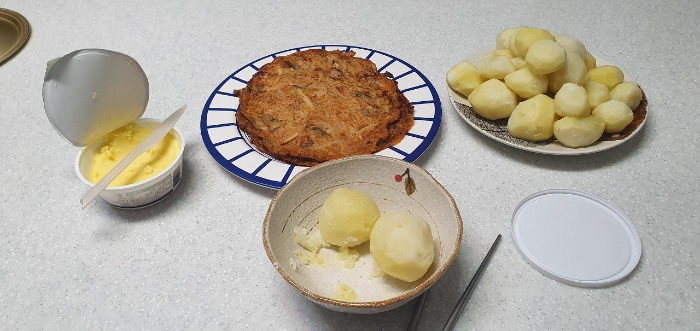 맛있는 통감자구이에 마가린 대신 버터를 발라 먹었다. 사장님이 만들어주신 지짐이는 덤이었다. 풍족한 한 끼가 완성된다.