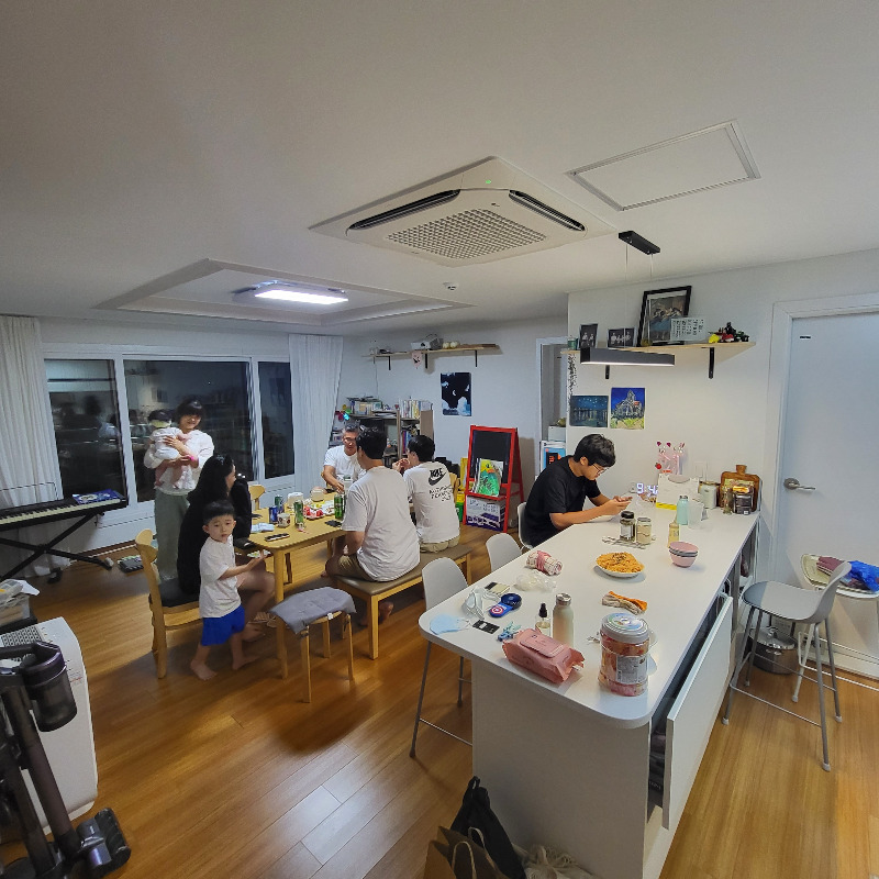 예배를 드리고 마지막 광고 시간에 신자분 한 분의 아드님이 갑작스럽게 사망하셨다는 소식을 들었다. 입관예배를 해야 하는데 가족이 없어서 참석할 수 있는 사람의 거의 없다는 말에 아내와 나는 의무감을 느낀다. 결국 아이들에겐 양해를 구하고 밤에 놀자고 말하고 제주시까지 다녀온다. 매번 내 휴가 때 교회에서는 어떤 일이 생긴다. 이것도 하나님이 나에게 주신 이웃 사랑의 사명이겠거니 하며 좋은 마음으로 그분의 안식을 염원한다. 제주시에 들른 김에 장도 보고 맛집도 들렀다가 집에 오니 아이들은 신나서 여전히 수영중이다. 서둘러 장 본 것을 풀고 저녁 채비를 한다. 제주에 오고 나서는 팟럭(potluck ; 각자 음식을 조금씩 가져와서 나눠 먹는 식사)이 익숙한 식문화가 되었다. 날씨가 특별히 궂거나 하지 않으면 마당은 최고의 식사 장소다. 게다가 수영하는 아이들을 지켜봐야 하기도 하고, 아이들과 같이 수영할 때도 있어 마당만큼 좋은 식사 장소도 없다. 그런데 오늘은 웬일인지 모두들 자연스레 집 안으로 모여들었다. 우리 집 안에서 식사를 하는데도 팟럭이 된다. 몇 가정이 더 각자의 음식을 싸들고 우리 집으로 모인다. 모처럼 아이들과 분리돼서 저녁을 먹으니 조용하다. 어른들끼리 신나게 수다를 떤다. 그래 가끔 엄빠들도 이런 시간이 필요해.