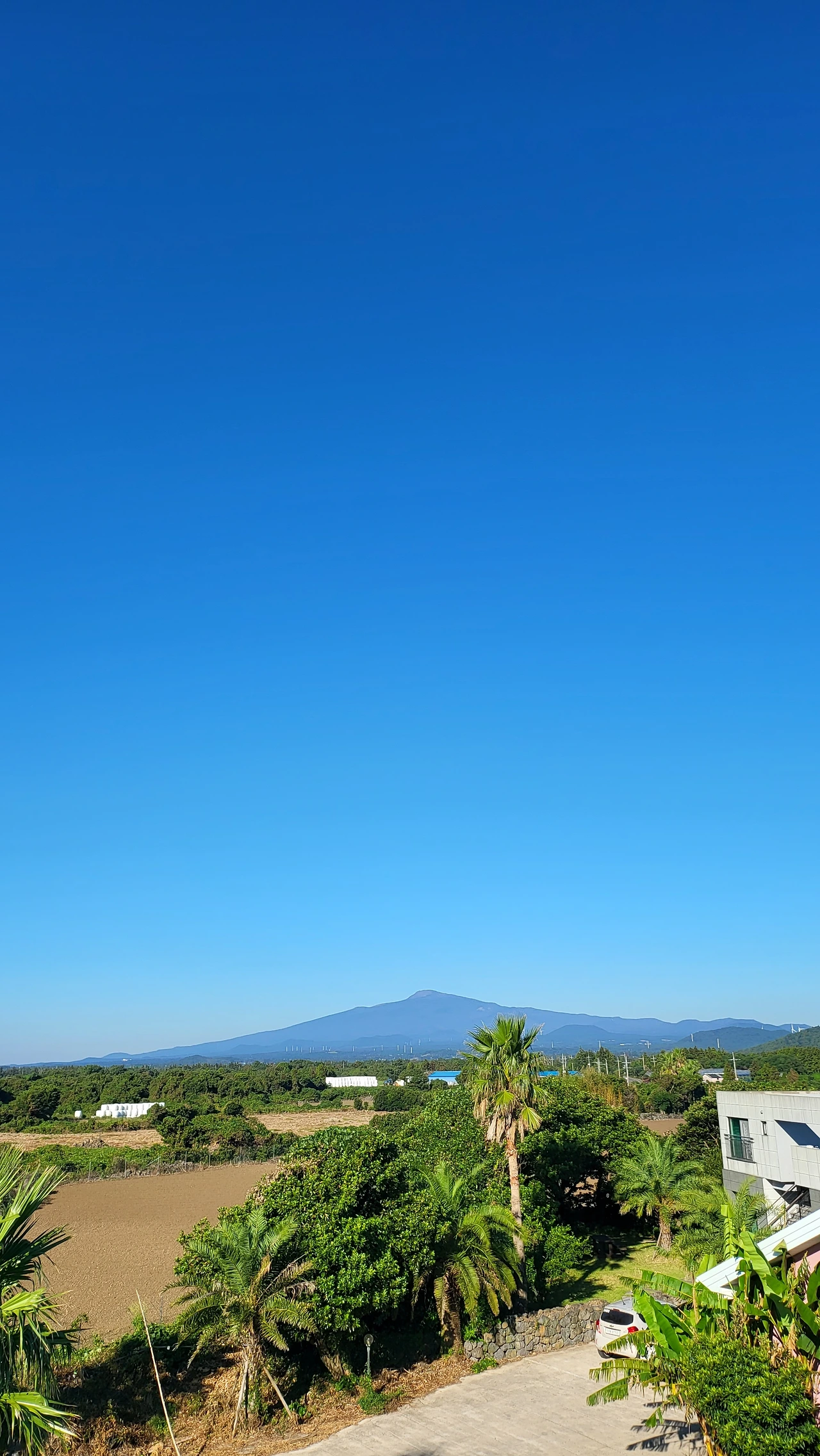구름 한 점 없는 맑은 날씨 아래 한라산의 실루엣이 선명하다. 하지만 여전히 푸르른 나무들을 보며 가을인지 여름인지 내 마음은 설레기만 하다.