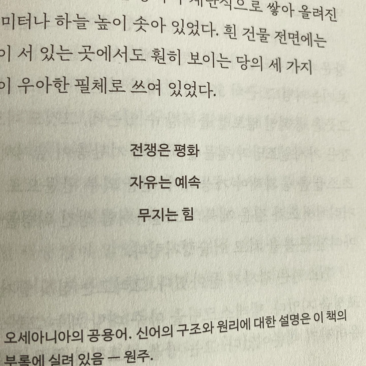 모두 알다시피 1984는 가상의 인물 윈스턴 스미스가 미래인 1984년을 살아가는 모습을 담은 소설집이다. 우린 그보다 훨씬 먼 미래에 살고 있지만 소설 속 사상과 상황이 극단적이긴 해도 기본적인 이념 시스템을 정확히 예측했었던 것 같다. 우린 모두 사상적 시스템에 완벽히 적응된 채 살아가고 있다. 소설 속 빅브라더가 통치하는 영사처럼 우리 역시 사상의 오류와 태세 전환에 눈과 귀를 닫고 적응한 것이다. 아주 쉽게 확인할 방법이 있다. 이렇게 질문을 던져 보는 것이다. #우리의주적은누구인가 얼토당토않은 쌍팔년도 단어인 듯 하지만 우리는 항상 마음속에 우리 국가, 즉 사상적 시스템의 주적을 담고 살아간다. 그런데 이 질문의 답이 세월에 따라 정세에 따라 달라진다는 것이다. 그런데도 우리는 혼란을 느끼며 이상하다고 생각하지 않는다. 마치 소설 속 당원들처럼 말이다. 왜일까? 소설을 덮은 순간 우린 깨달은 자가 되어 멀리서 내려보는 게 아니라 그 속에 살아있는 무지스러운 인간이 된다.