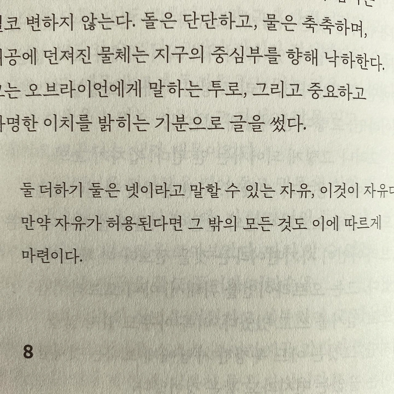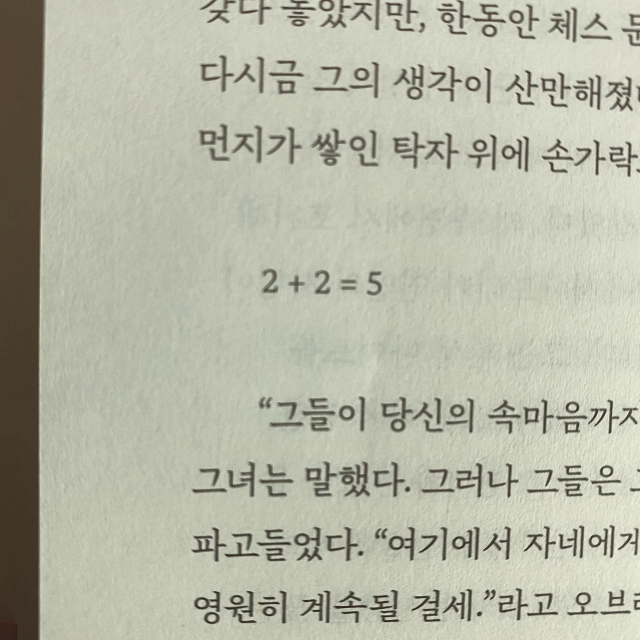 #2+2=5 이 수식을 만난다. 내가 아주 좋아하는 영국 밴드 #라디오헤드 라는 팀의 노래 제목이기도 한데 당시 곡을 적은 리더 #톰요크 가 이 노래를 당시 미국 부시 정부를 지지하는 듯한 인터뷰를 했다가 수많은 팬에게 뭇매를 맞은 적이 있다. 당시에는 그저 의미 없는 제목이겠거니와 했고 별 의미 없이 음악적인 부분으로만 받아들였는데 이 책에서 이 수식을 만나고 소설 마지막 문장을 만나는 순간, 톰 요크가 어떤 생각으로 곡을 적었고 인터뷰에서 이상한 말을 했는지 이해가 갔다. 변화를 꿈꾸는 자체가 사상죄가 되어 억압당하고 마음속까지 검열당하는 세상에 2+2=5는 가만히 인정해야 할 진단키트이다. 그리고 그 진단키트는 어쩜 100% 정확한 것일지도 모른다는 것이다. 당신이 올바르다고 생각하는 게 정말 올바르다는 것은 누가 증빙할 것인가?