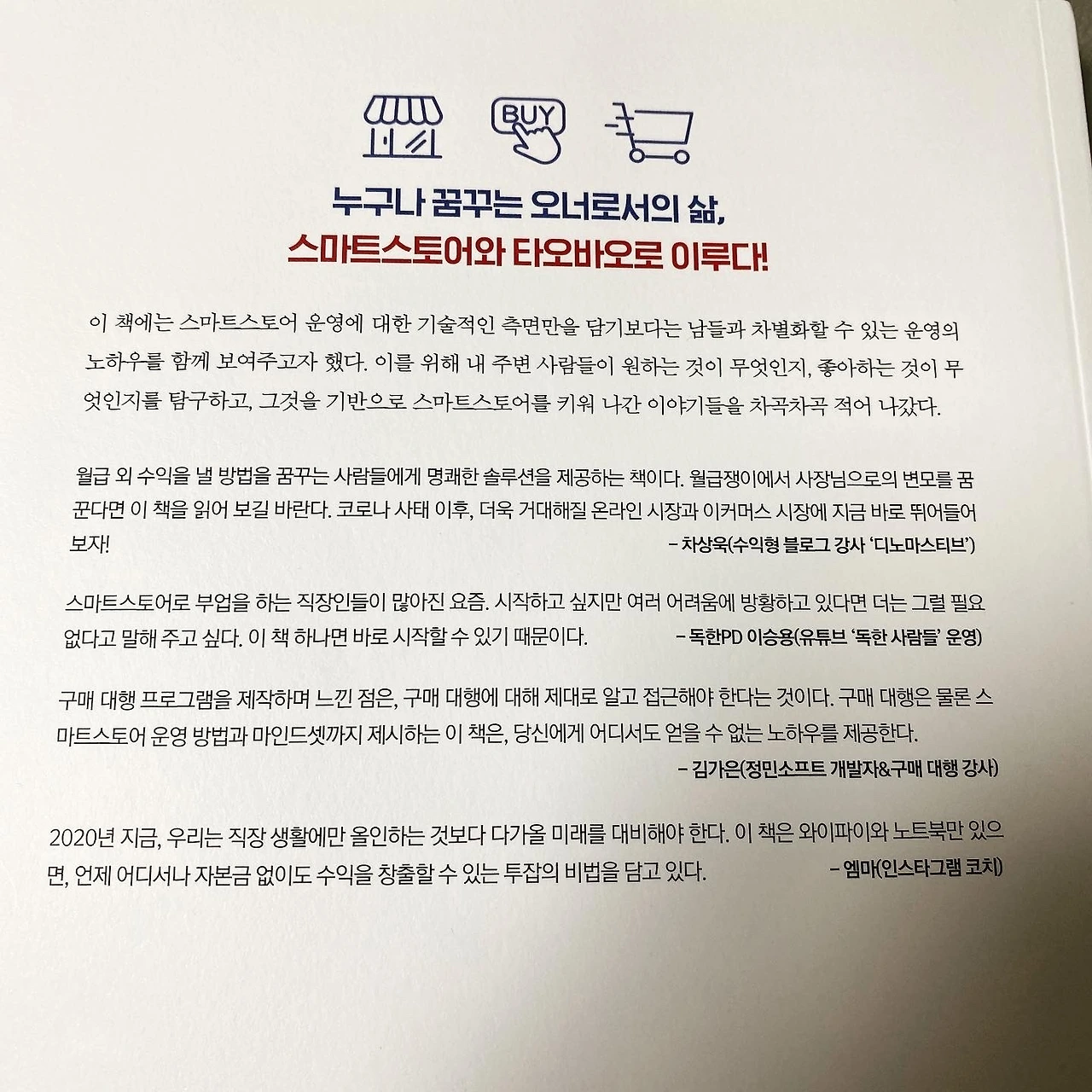 내 궁금증은 이것이었다. 이렇게 많은 플랫폼 스토어에 셀러들이 넘쳐나는데 그들은 그 많은 판매 상품을 어떻게 쌓아두고 팔고 있을까? 지금 생각하니 조금은 순진한 것 같다. 그들이 물류창고를 가지지 않았다. 그들이 어떻게 물건을 판매할 수 있는지 어떤 시스템으로 플랫폼 판매가 이루어지는지 속 시원하게 알게 되었다. 이 책은 중국 타오바오 물건을 자신이 중국 내 물류센터(배송대행지)를 통해 판매할 수 있는지 상세한 방법을 알려준다.